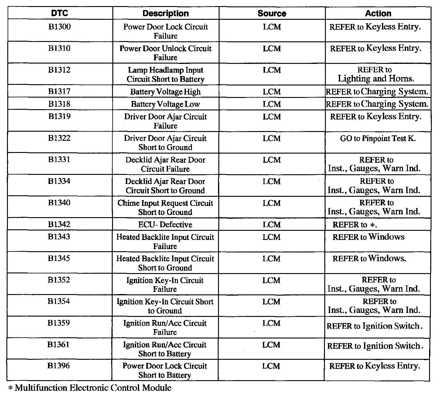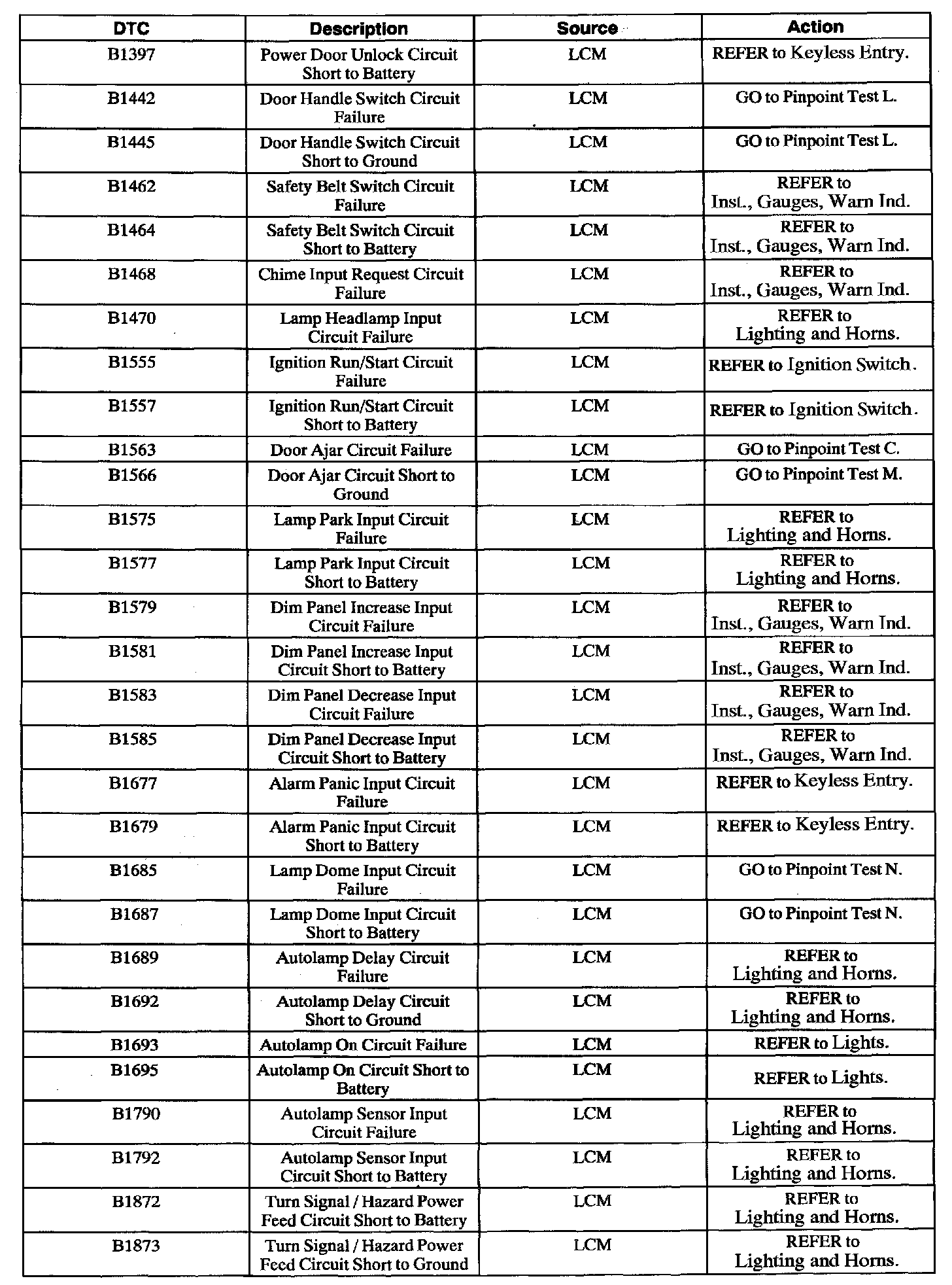 Lighting Control Module (LCM) Diagnostic Trouble Code Index