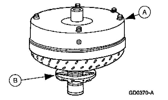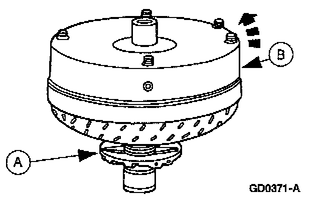 2. Mount (A) torque converter on the (B) front pump support with the splines on the one-way clutch inner race, engaging the mating splines of the front pump support.