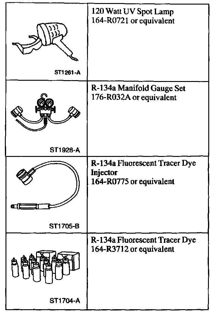 NOTE: Ford Motor Company vehicles are produced with R-134a Leak Tracer Dye incorporated into the A/C system. The location of leaks can be pinpointed by the bright yellow-green glow of the tracer dye. Since more than one leak can exist, always inspect each component.