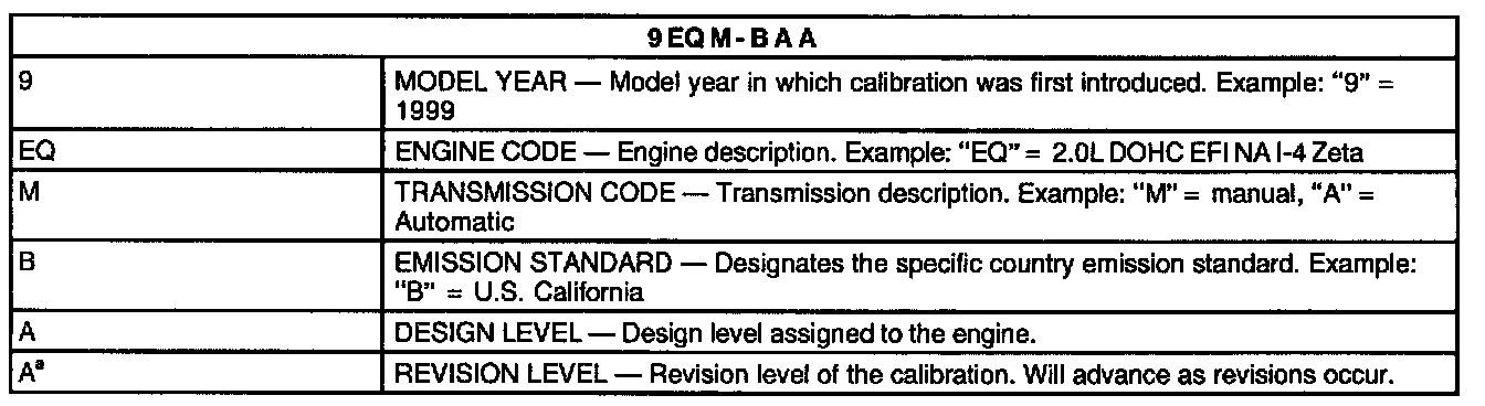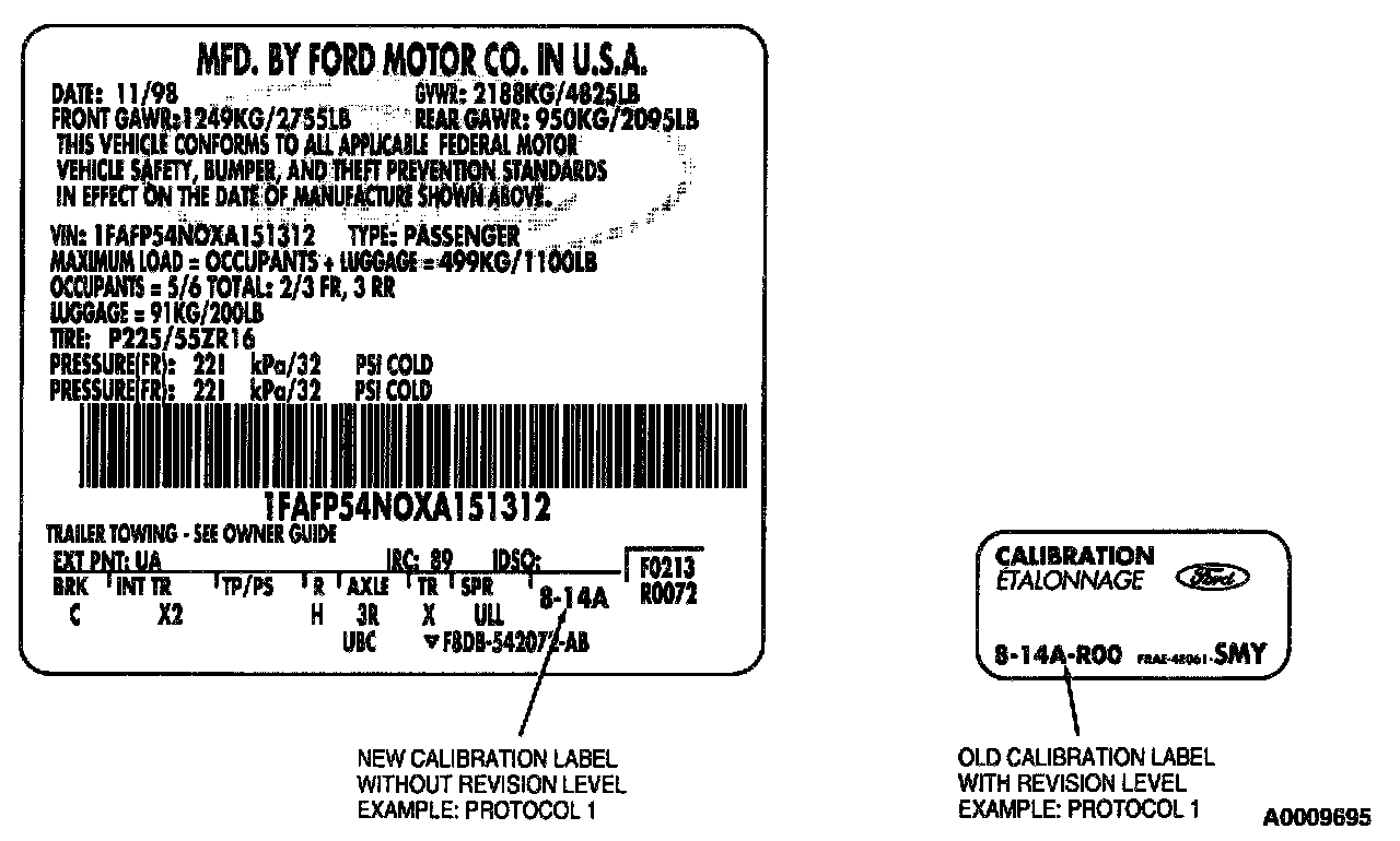 Powertrain Base Calibration Information is located in the lower right corner of the Vehicle Certification Label. Only the Base Calibration will appear on this label. The Revision Level is no longer printed on the label; however, it can be found in On-Line Automotive Service Information System (OASIS). For the current model year Ford Motor Company is using three different Protocols which describe Powertrain Base Calibration. The Protocols are designed to provide worldwide standardization for vehicle calibration. If Electronic EC's strategy is two years old and carried over to the current model year, Protocol 1 is used. If Electronic EC's strategy is one year old and carried over to the current model year, Protocol 2 is used. New strategies for the current model year use Protocol 3. For more information on Vehicle Certification Label or Powertrain Calibration, refer to the Vehicle System.