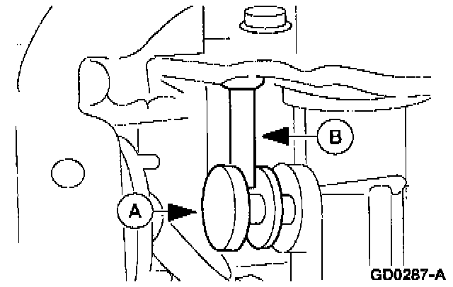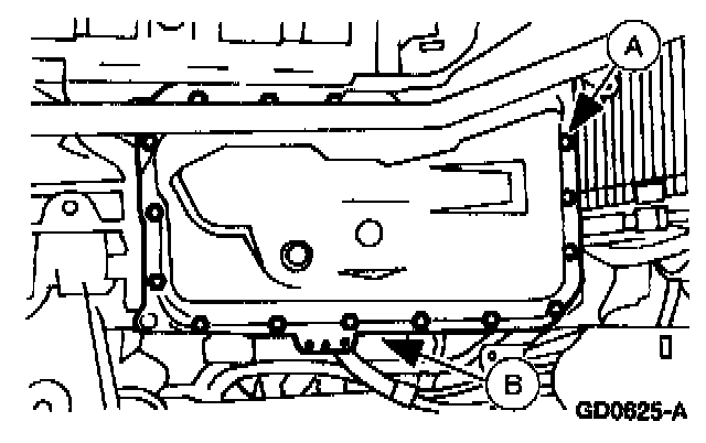 Place a suitable container beneath the transmission fluid pan, then remove the (A) transmission fluid pan bolts and the (B) transmission fluid pan.
