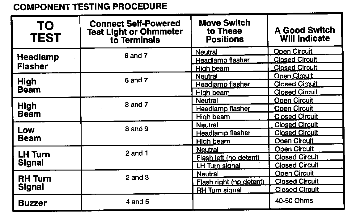The component connector MUST BE REMOVED before testing. To test a single circuit within the component, select that circuit under the column TO TEST If you wish to test the complete component, perform all tests.