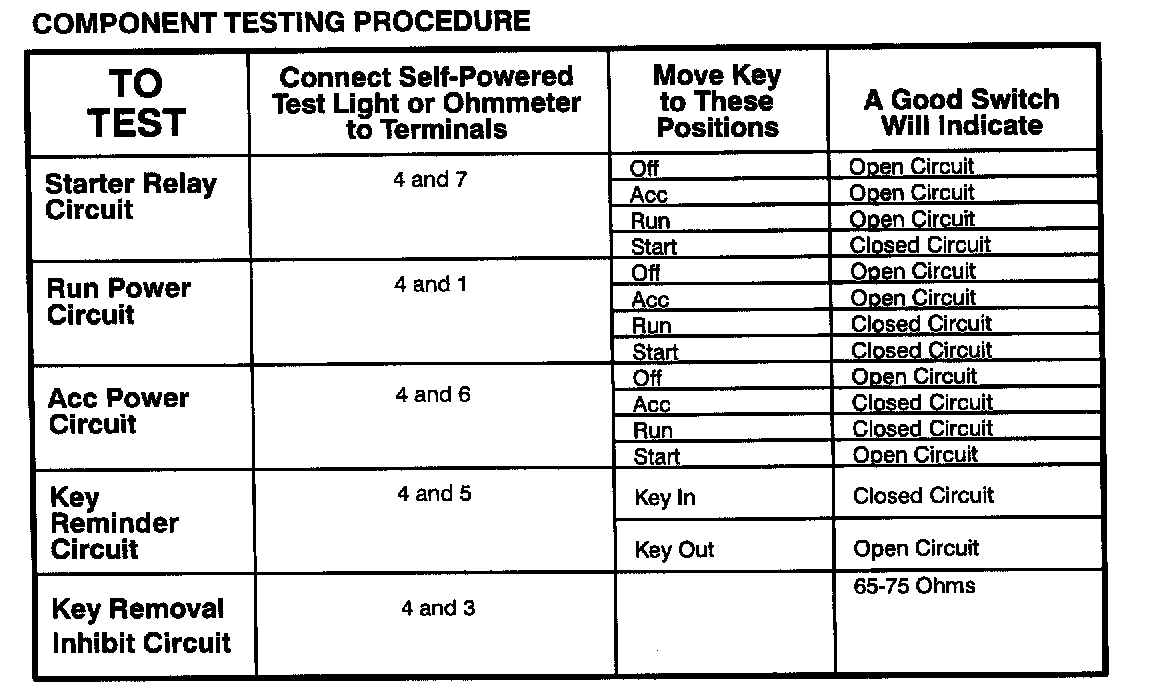 The component connector MUST BE REMOVED before testing. To test a single circuit within the component, select that circuit under the column TO TEST If you wish to test the complete component, perform all tests.