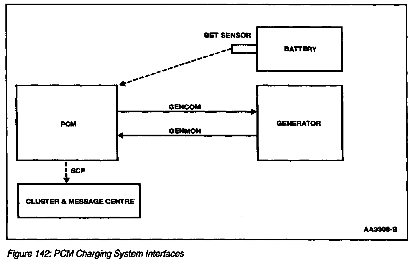 The Powertrain Control Module (PCM)-Controlled charging system provides many additional benefits over the current Integral Generator Regulator system. The first benefit is improved battery life. In an integral generator regulator system, the regulator set point is established by a temperature sensor in the regulator which estimates battery temperature. Field data has shown this approach lacks accuracy. With a PCM-controlled generator, the regulator voltage set point is determined by the PCM and communicated to the regulator via the generator communication line. The PCM will use a calibratable algorithm to estimate battery temperature. Improving battery temperature estimates will reduce battery damage caused by over- and undercharging.