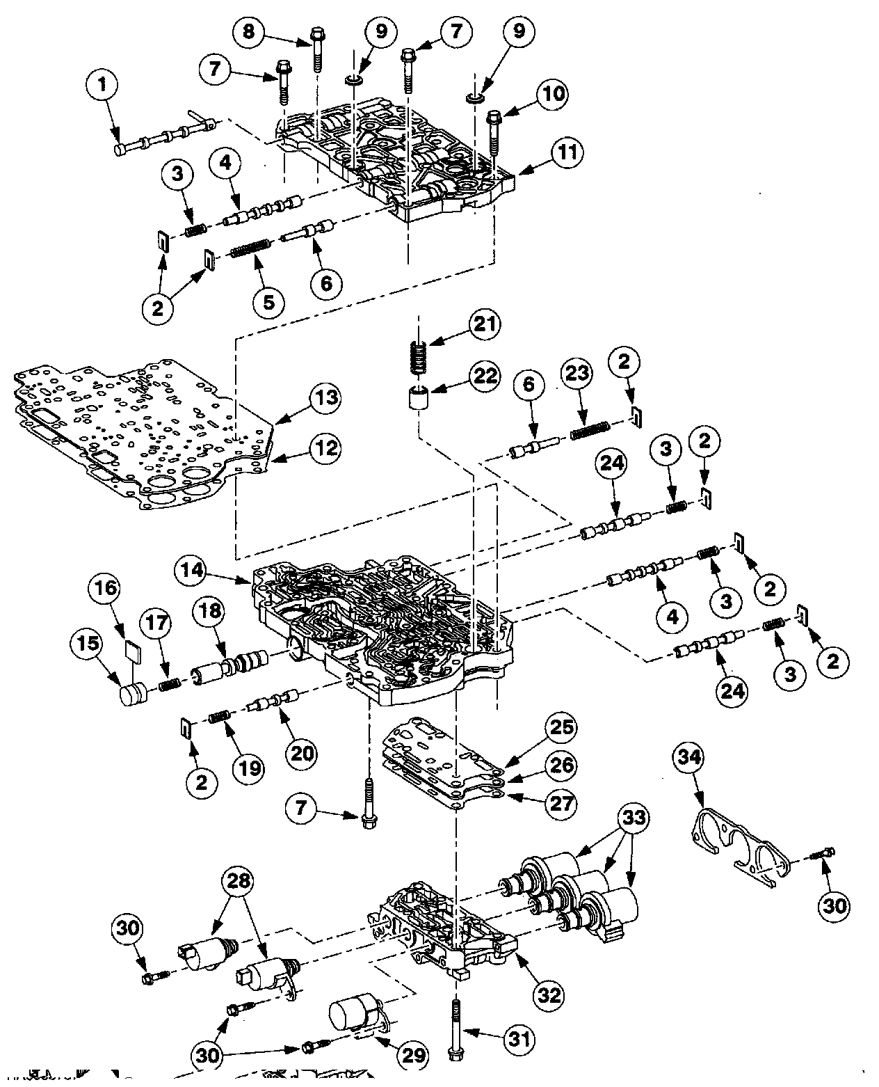1. Remove the solenoid body bolts and the solenoid body.
