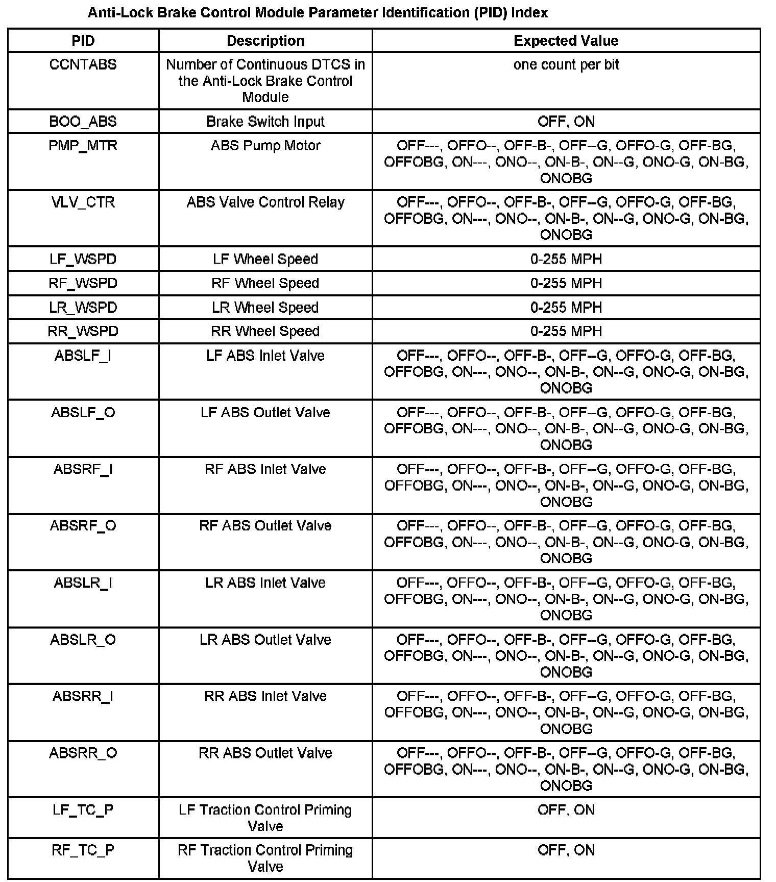 ABS Control Module Parameter Identification (PID) Index