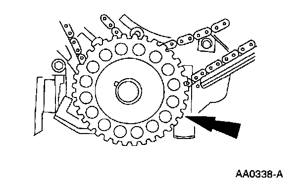 1 Compress the timing chain tensioner and install the retaining pins.