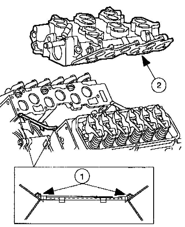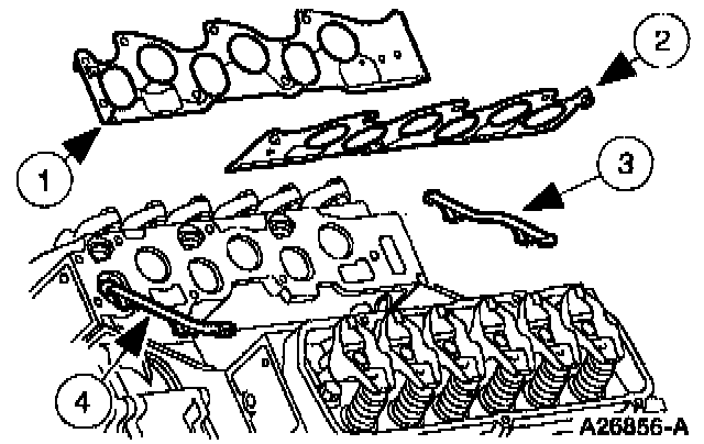 1 Apply a bead of sealant to the lower intake manifold mounting at the points indicated. Use Silicone Gasket and Sealant F7AZ-19554-EA or equivalent meeting Ford specification WSE-M4G323-A4.