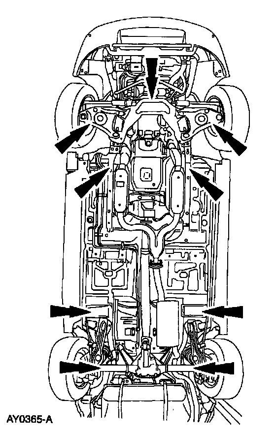 ^ Do not lift vehicle on rocker panel pinch flange or convertible cross brace. Body damage may occur.