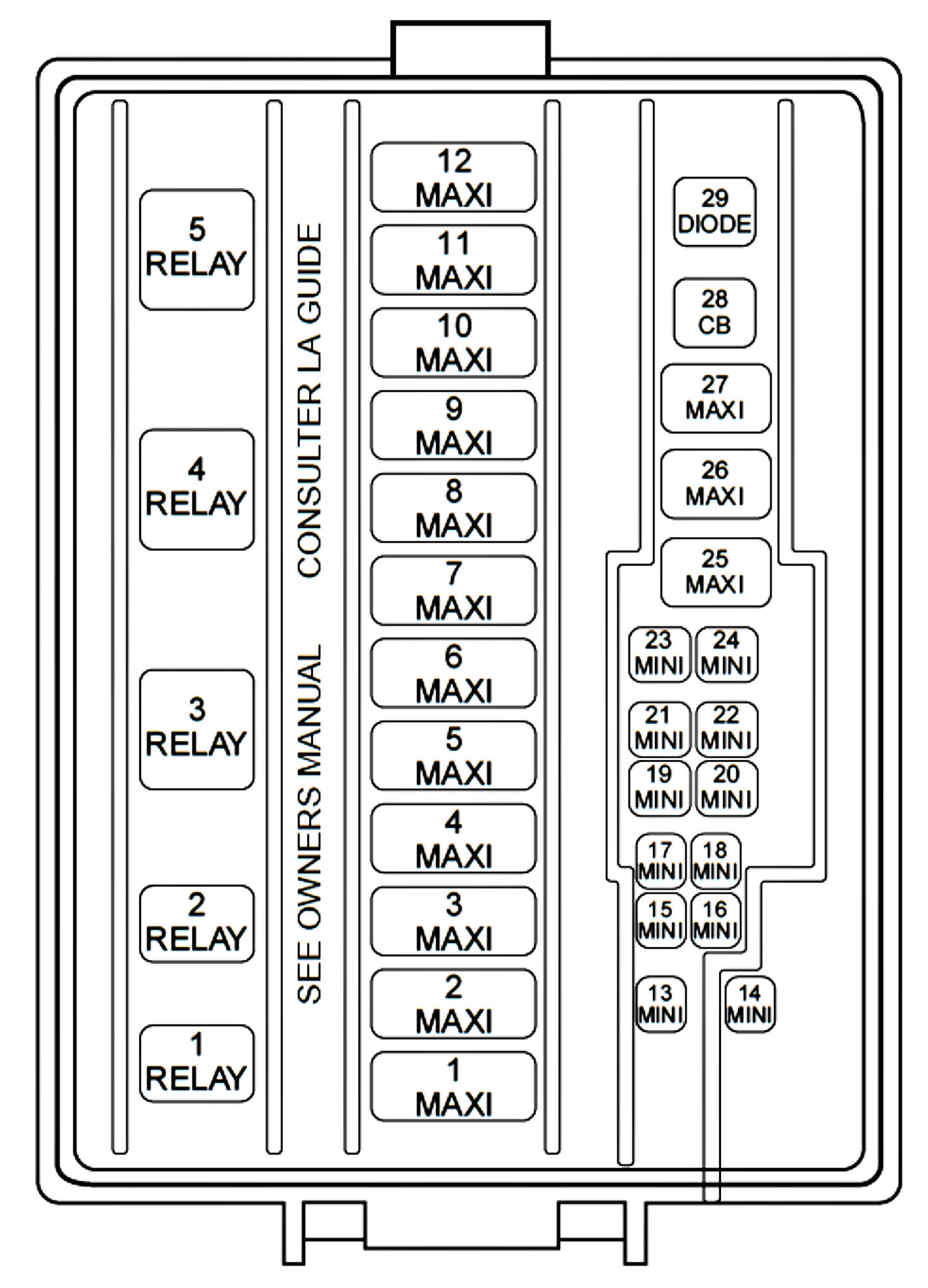 ALLDATA Editor's Note: Ford identifies this one component by 2 different names. Users have reported success comparing these images to determine Application/ID or Location of Fuses and Relays with the Power Distribution Box / Battery Junction Box (BJB).