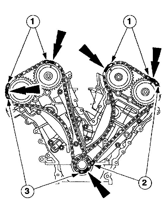 CAUTION: Timing chain size must be determined before timing the engine, by counting the teeth on the camshaft sprockets. Camshaft sprockets with 36 teeth will have a 9.52 mm (3/8 in) chain. Camshaft sprockets with 42 teeth will have an 8 mm (5/16 in) chain. Failure to identify the correct chain size before assembly will result in severe engine damage.CAUTION: Failure to verify correct timing drive component positioning will result in severe engine damage.