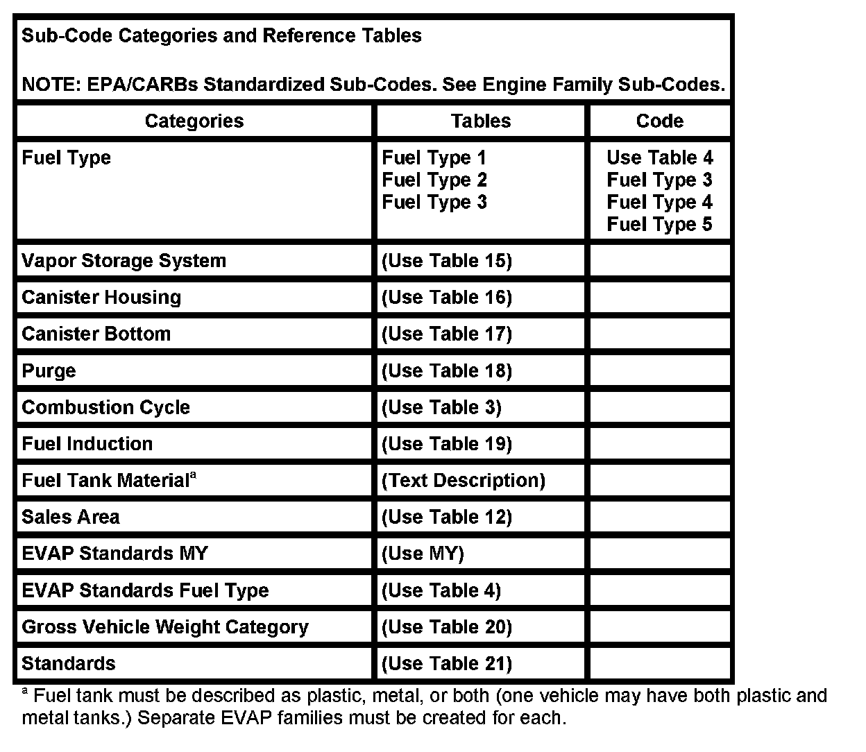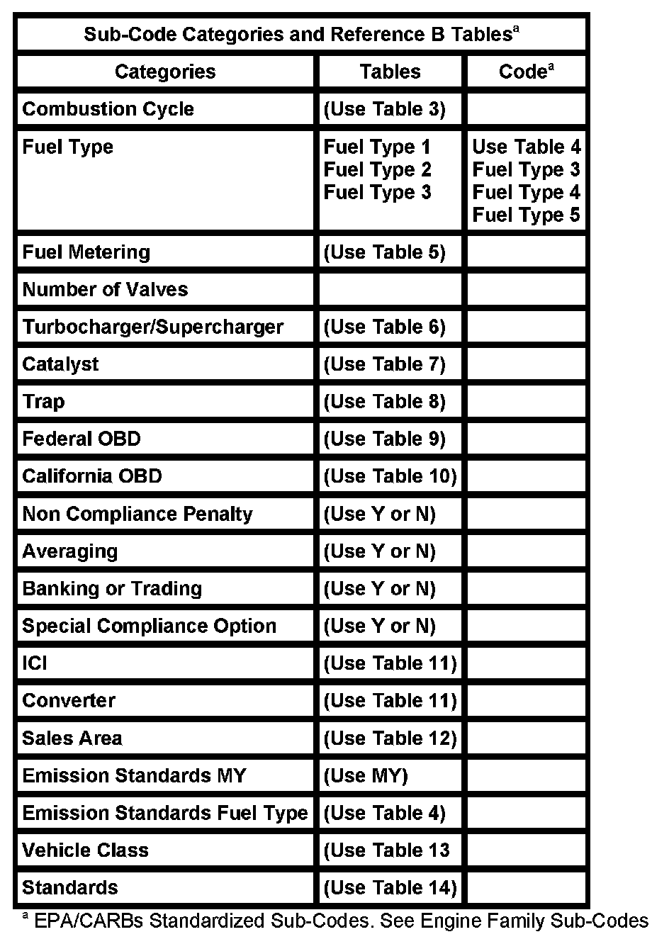 Note: EPA/CARBs Standardized Sub-Codes.