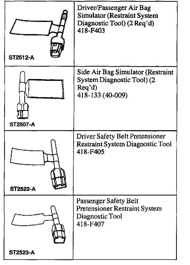 ^ Airbag simulators (restraint system diagnostic tools) MUST be installed under the seats in the side airbag and safety belt pretensioner (if equipped) to floor connectors.