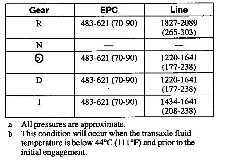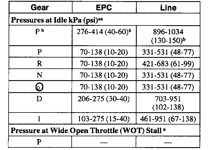 5. Start the engine and check the EPC pressure; refer to the Line Pressure Chart for specifications.