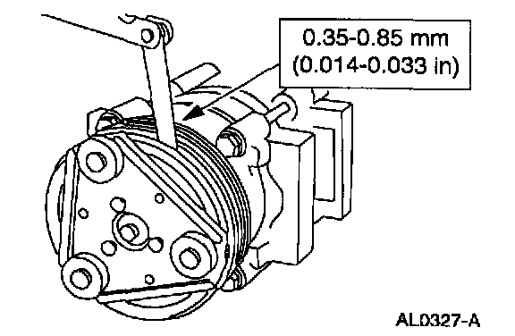 2. Remove the A/C clutch. Add or remove spacers between the A/C clutch and the compressor shaft until clearance is within specification.