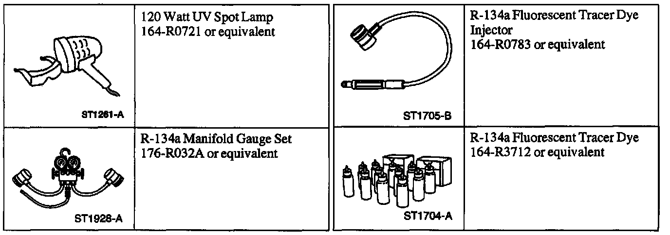 NOTE: Ford Motor Company vehicles are produced with R-134a Fluorescent Tracer Dye incorporated into the A/C system. The fluorescent life span of the leak tracer dye is 500 hours of A/C system use, after which another injection of dye is required. The location of leaks can be pinpointed by the bright yellow-green glow of the tracer dye. Since more than one leak can exist, always inspect each component.