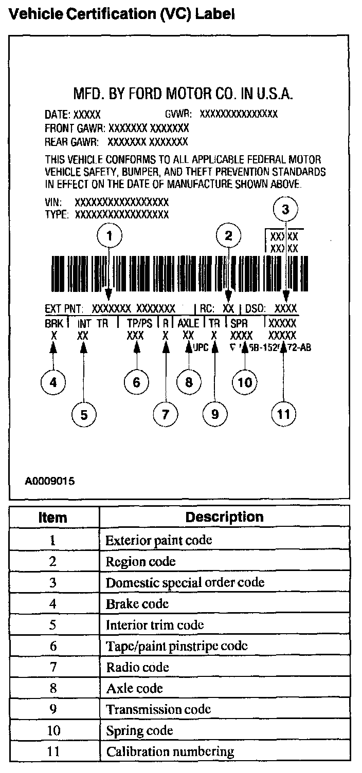 Powertrain calibration information is printed in the lower right corner of the Vehicle Certification Label. Only the base calibration information is printed. Revision levels will not appear, however, they can be found in on line automotive service information system. For the current model year, Ford Motor Company is using three different protocols which describe powertrain base calibration. These protocols are designed to provide worldwide standardization for vehicle calibration. If the electronic calibration strategy has been used since 1998 and carried into the current model year, protocol 1 will be used. If the electronic calibration strategy has been used since 1999 and is carried into the current model year, protocol 2 will be used. For new electronic calibration strategies for the current model year, protocol 3 will be used. For additional information, refer to the Powertrain Management.