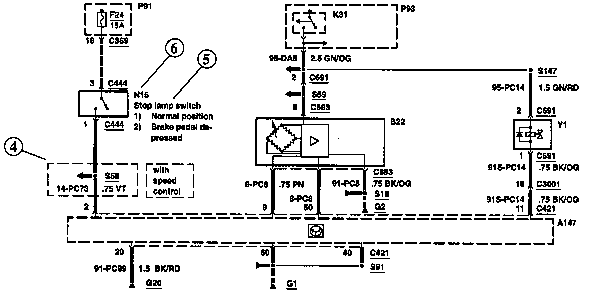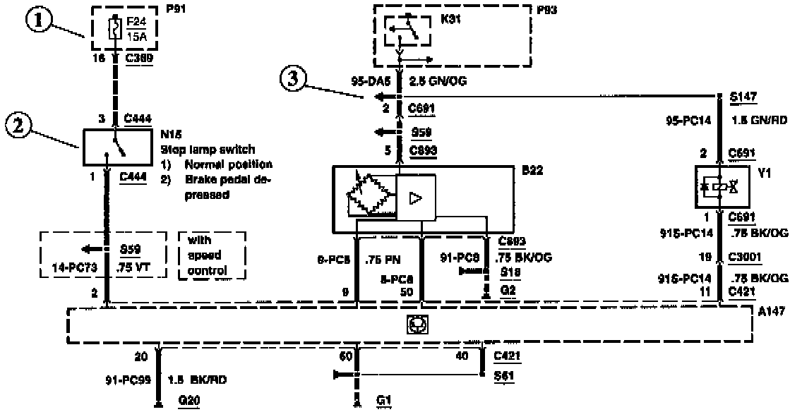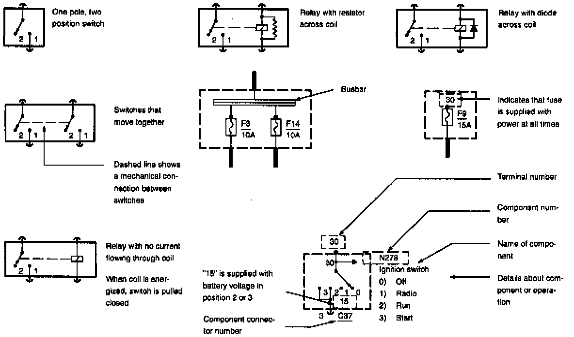 Each set of diagrams normally starts with the component that powers the circuit such as a fuse or the ignition switch. Current flow is shown from the power source at the top of the diagram to ground at the bottom of the diagram. In order to concentrate on the essential parts, power supply and ground connections are sometimes simplified by a dashed line in the diagrams.