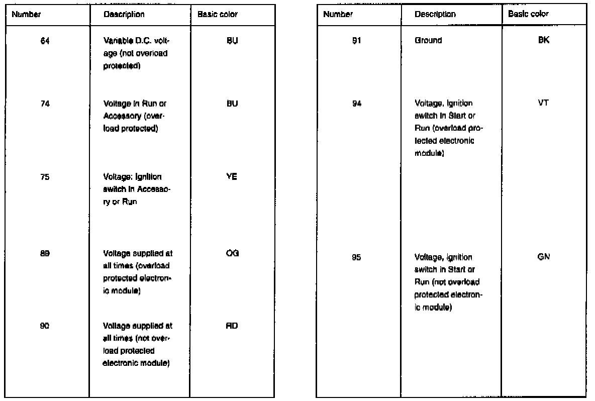 The wire identification consists of a basic color and an identification color, and is determined directly from the wire's circuit number. In the schematics the wire colors are indicated next to the wires.