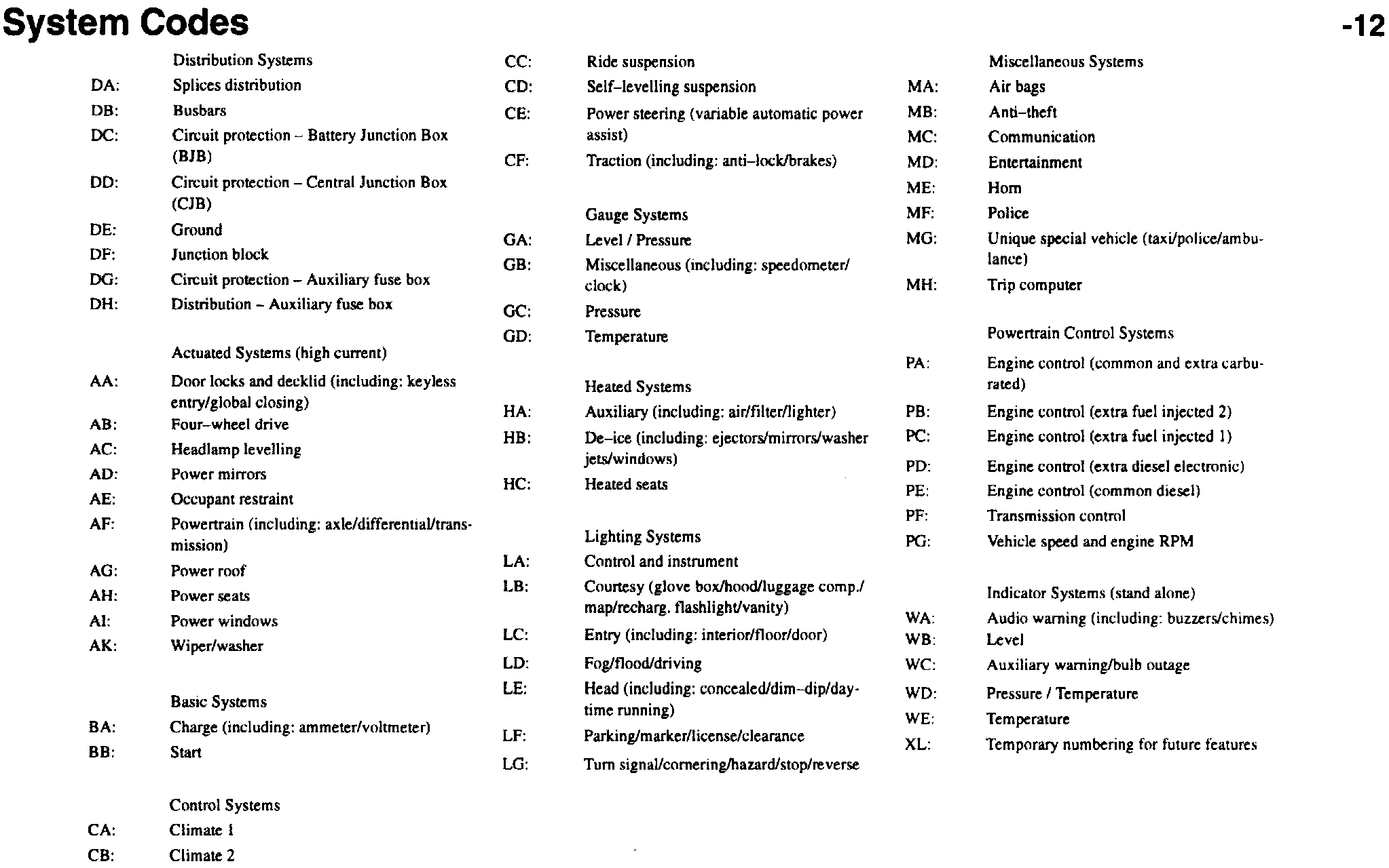 Systems are related to subsets of the vehicle circuitry. Immediately following the system letter code is the connection number specific to that system. A branch identification is used to differentiate wires in one connection with the same function.