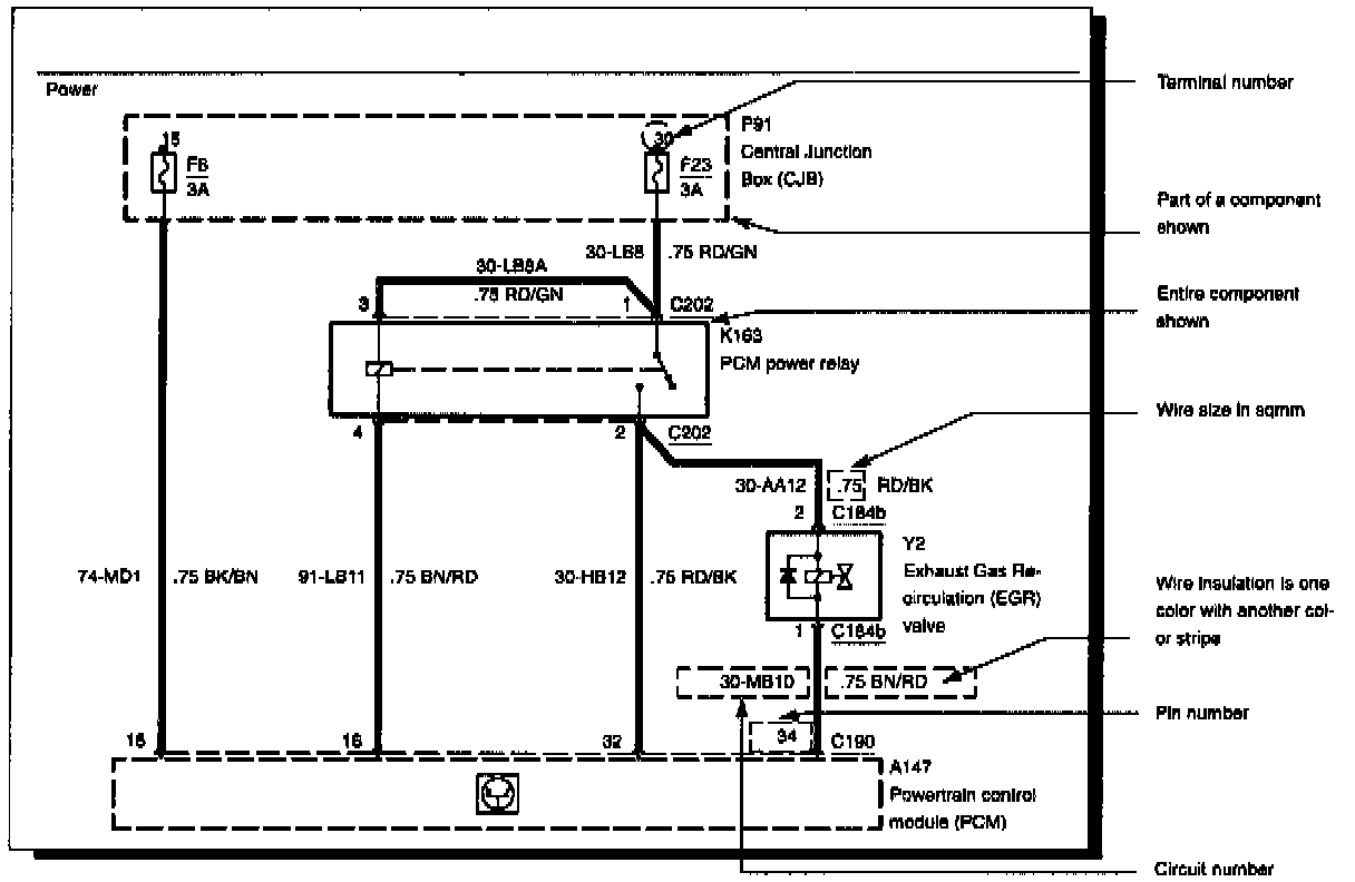 Using the circuit number and wire identification used in the Wire Identification Example, we know the following information about the wire: