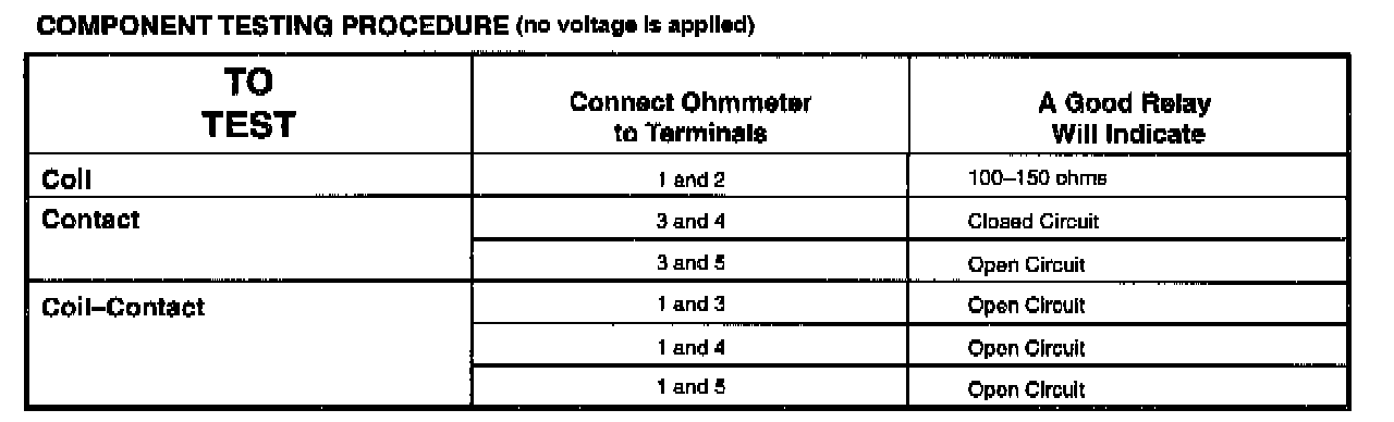 Disconnect the ohmmeter; connect pins 2 and 3 to 12 V DC power and pin 1 to ground. Measure voltage between pin 5 and pin 1. If the voltage is 12 V, continue with the test. If not, replace the relay. Disconnect power from pin 2 and measure voltage between pin 4 and pin 1. If the voltage is 12 V, the relay is okay. It not, replace the relay.