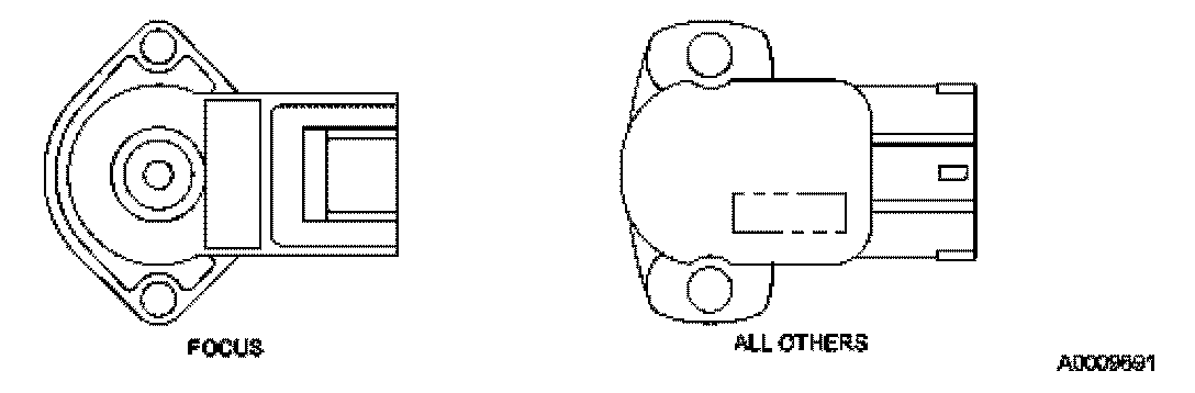 The throttle position (TP) sensor (Figure 40) is a rotary potentiometer sensor that provides a signal to the PCM that is linearly proportional to the throttle plate/shaft position. The sensor housing has a three-blade electrical connector that may be gold plated. The gold plating increases corrosion resistance on terminals and increases connector durability. The TP sensor is mounted on the throttle body. As the TP sensor is rotated by the throttle shaft, four operating conditions are determined by the PCM from the TP. Those conditions are closed throttle (includes idle or deceleration), part throttle (includes cruise or moderate acceleration), wide open throttle (includes maximum acceleration or de-choke on crank), and throttle angle rate.