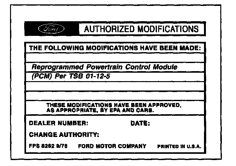 Obtain an Authorized Modifications Decal (FPS 8262 - obtainable through DOES II, 25/pkg) and list the date, dealer number, and summary of modifications performed. Select a prominent place adjacent to the Vehicle Emission Control Information Decal suitable for installing the Authorized Modifications Decal. Clean the area, install the decal, and cover it with a clear plastic decal shield.