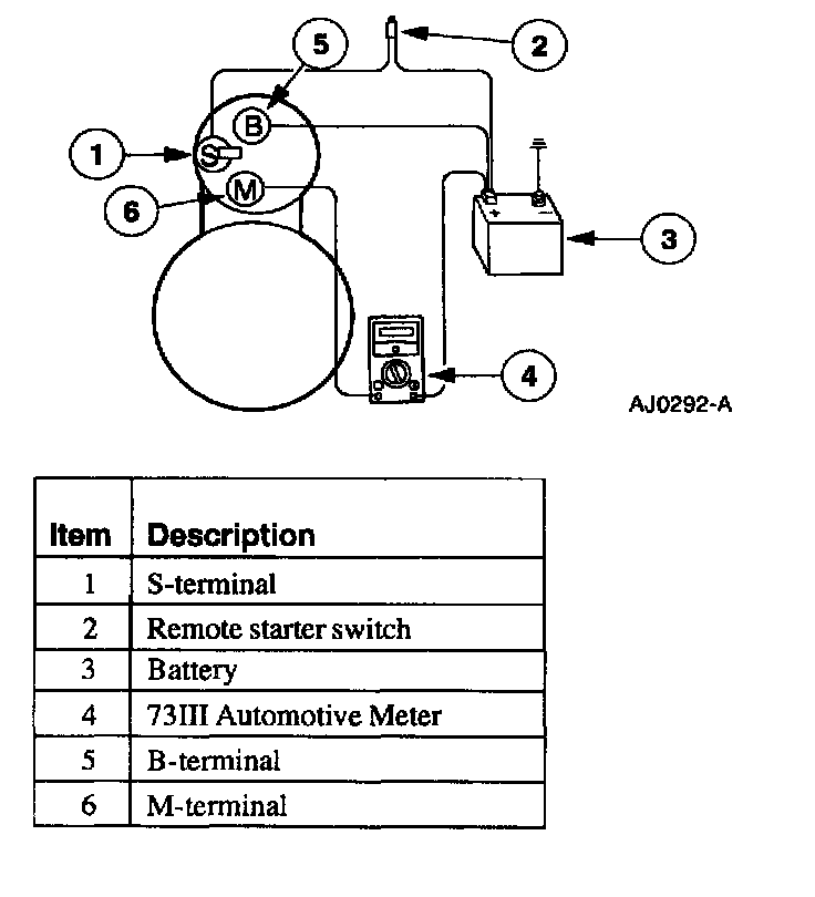 STARTER MOTOR COMPONENT TESTWARNING: WHEN REPAIRING THE STARTER MOTOR OR WORKING UNDERHOOD IN THE VICINITY OF THE STARTER MOTOR, BE AWARE THAT THE HEAVY GAUGE BATTERY INPUT LEAD AT THE STARTER SOLENOID IS ELECTRICALLY HOT AT ALL TIMES.