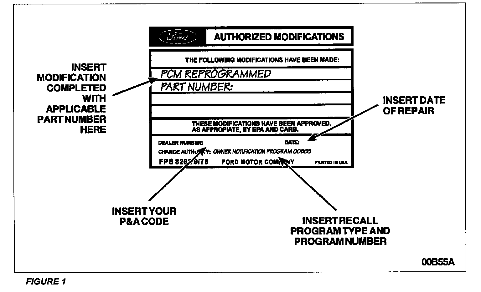 1. Obtain and prepare the Authorized Modifications Label. Write the modification completed with the Part Number from the calibration chart, your P&A Code, date of repair and the recall program type and program number. See Figure 1.