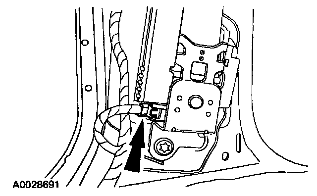 32. Pushing in on the release tab, disconnect the driver safety belt retractor pretensioner electrical connector.