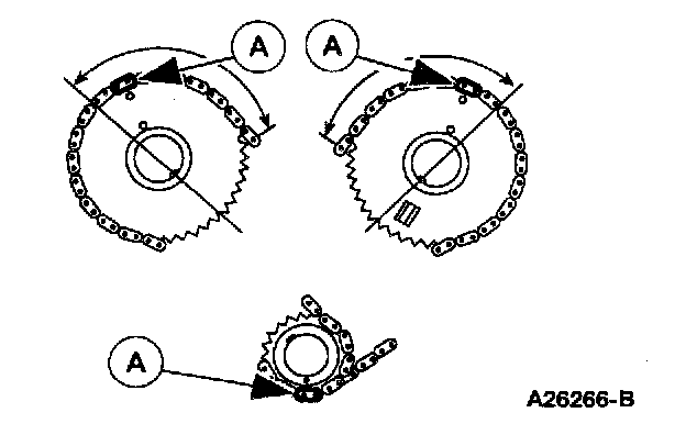 Make sure that the (A) copper marks on the timing chain/belt are lined up with the corresponding dots on the crankshaft sprockets and the camshaft sprocket.