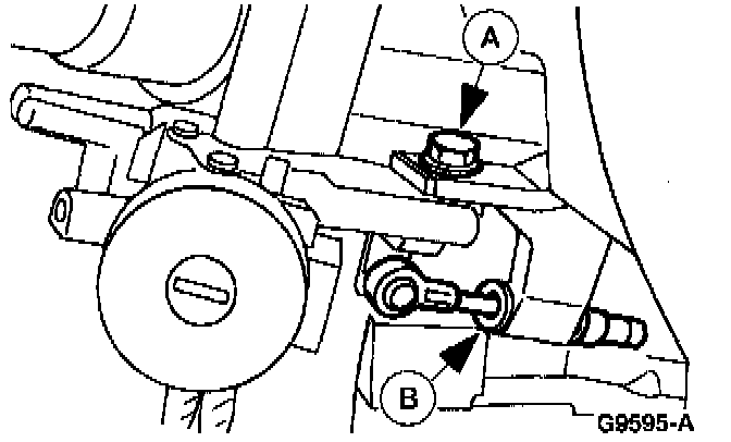 3. Remove the (A) bolt and position the (B) bracket and ignition/shifter interlock cable aside.