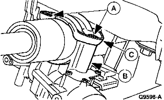 5. Remove the (A) break-away bolts, the (B) ignition switch lock cylinder, and the (C) bracket.