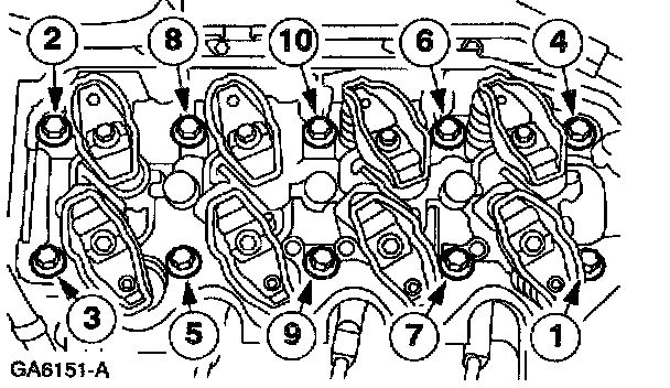 Install the cylinder head assembly and tighten the cylinder head bolts in the following sequence.