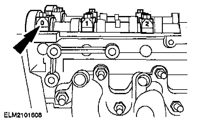Apply a thin coat of gasket maker to the marked areas on camshaft bearing caps 0 and 5.
