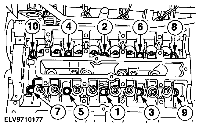 42. NOTE: Working in several stages, evenly screw in the camshaft bearing cap bolts in the indicated sequence, half a turn at a time, and then tighten them down in two stages.
