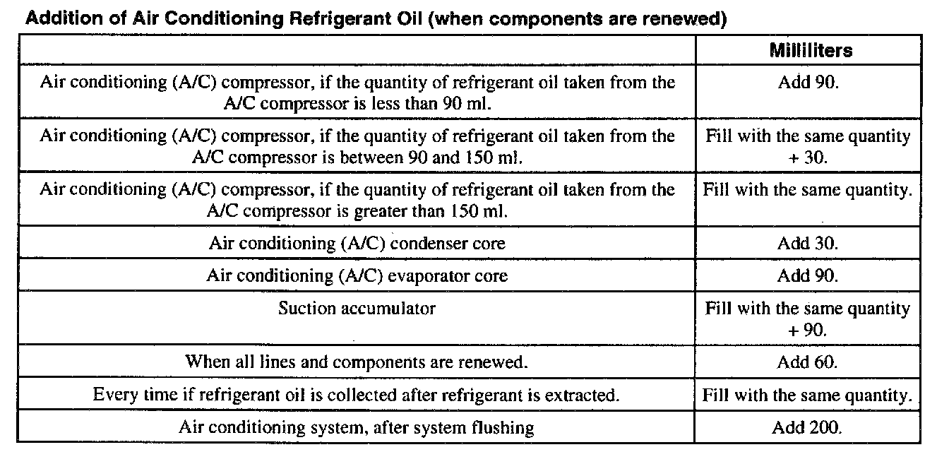 Addition Of Air Conditioning Refrigerant Oil (when Components Are Renewed):