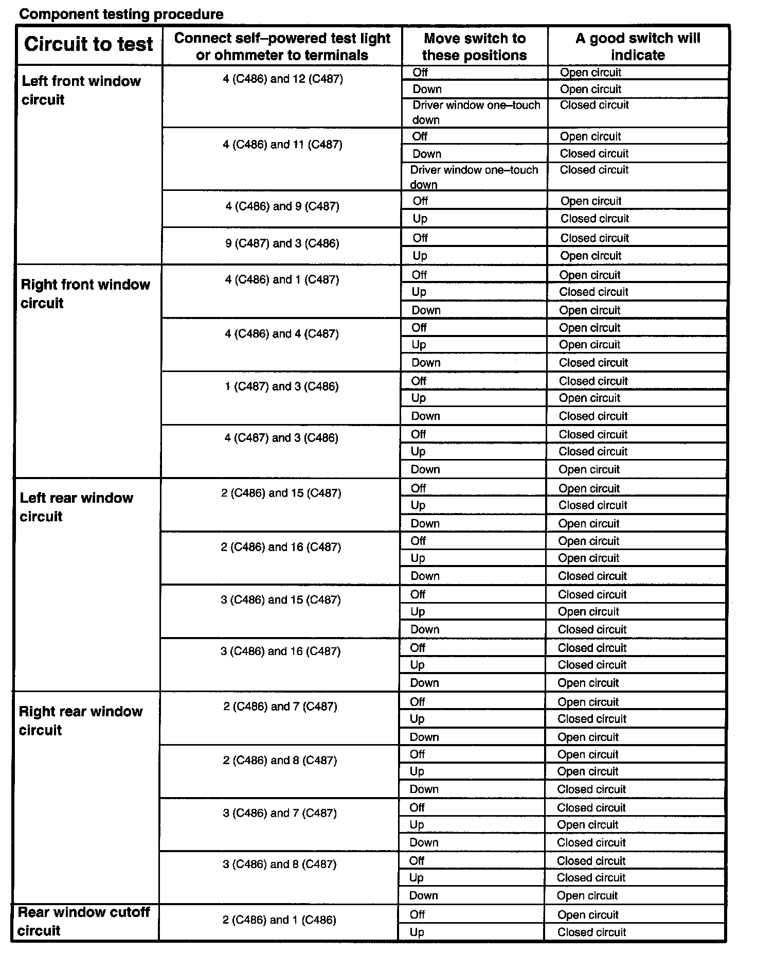 The component connector MUST BE REMOVED before testing. To test a single circuit within the component, select that circuit under the column TO TEST. If you wish to test the complete component, perform all tests.