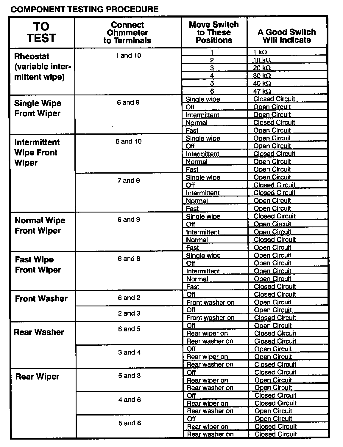 The component connector MUST BE REMOVED before testing. To test a single circuit within the component, select that circuit under the column TO TEST. If you wish to test the complete component, perform all tests.
