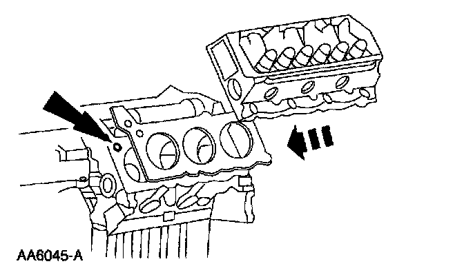 2. Install a new head gasket on the cylinder block with the small hole to the front of the engine.