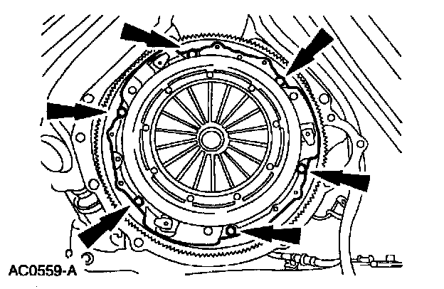 NOTE: If the parts are to be reused, mark the clutch pressure plate and the flywheel.