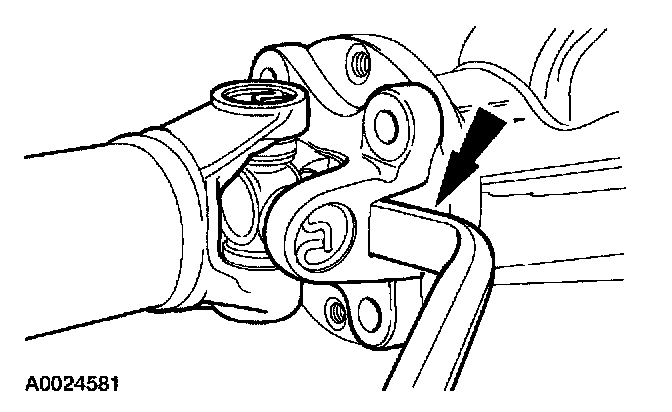 CAUTION: The driveshaft centering socket yoke fits tightly on the pinion flange pilot. Never hammer on the driveshaft or any of its components to disconnect the yoke from the flange. Pry only in the area shown, with a suitable tool, to disconnect the yoke from the flange.