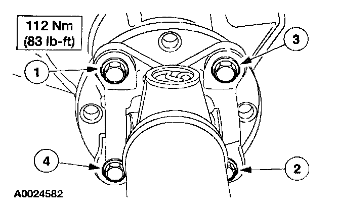 CAUTION: The driveshaft centering socket yoke fits tightly on the pinion flange pilot. To make sure that the yoke seats squarely on the flange, tighten the bolts evenly in a cross pattern as shown.