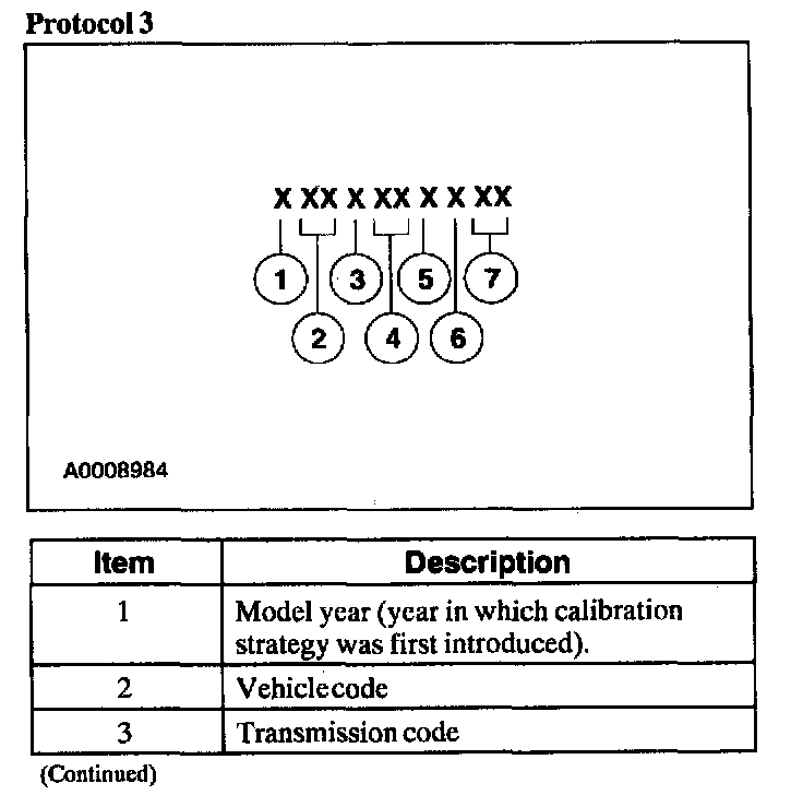 Powertrain calibration information is printed in the lower right comer of the Vehicle Certification Label. Only the base calibration information is printed. Revision levels will not appear, however, they can be found in On Line Automotive Service Information System (OASIS). For the current model year, Ford Motor Company is using three different protocols which describe powertrain base calibration. These protocols are designed to provide worldwide standardization for vehicle calibration. If the electronic calibration strategy has been used since 1998 and carried into the current model year, protocol 1 will be used. Refer to Protocol 1. If the electronic calibration strategy has been used since 1999 and is carried into the current model year, protocol 2 will be used. Refer to Protocol 2. For electronic calibration strategies introduced in the 2000 or 2001 model year, protocol 3 will be used. Refer to Protocol 3.
