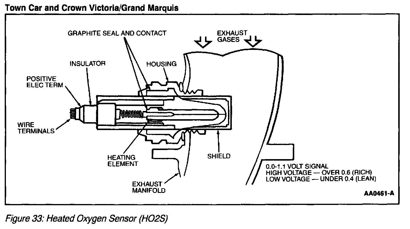 The Heated Oxygen Sensor (HO2S) (Figure 33) detects the presence of oxygen in the exhaust and produces a variable voltage according to the amount of oxygen detected. A high concentration of oxygen (lean air/fuel ratio) in the exhaust produces a low voltage signal less than 0.4 volt. A low concentration of oxygen (rich air/fuel ratio) produces a high voltage signal greater than 0.6 volt. The HO2S provides feedback to the PCM indicating air/fuel ratio in order to achieve a near stoichiometric air/fuel ratio of 14.7:1 during closed loop engine operation. The HO2S generates a voltage between 0.0 and 1.1 volts.