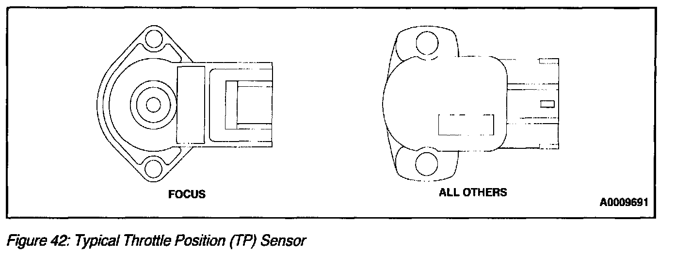 The Throttle Position (TP) sensor (Figure 42) is a rotary potentiometer sensor that provides a signal to the PCM that is linearly proportional to the throttle plate/shaft position. The sensor housing has a three-blade electrical connector that may be gold plated. The gold plating increases corrosion resistance on terminals and increases connector durability. The TP sensor is mounted on the throttle body. As the TP sensor is rotated by the throttle shaft, four operating conditions are determined by the PCM from the TP. Those conditions are closed throttle (includes idle or deceleration), part throttle (includes cruise or moderate acceleration), wide open throttle (includes maximum acceleration or de-choke on crank), and throttle angle rate.