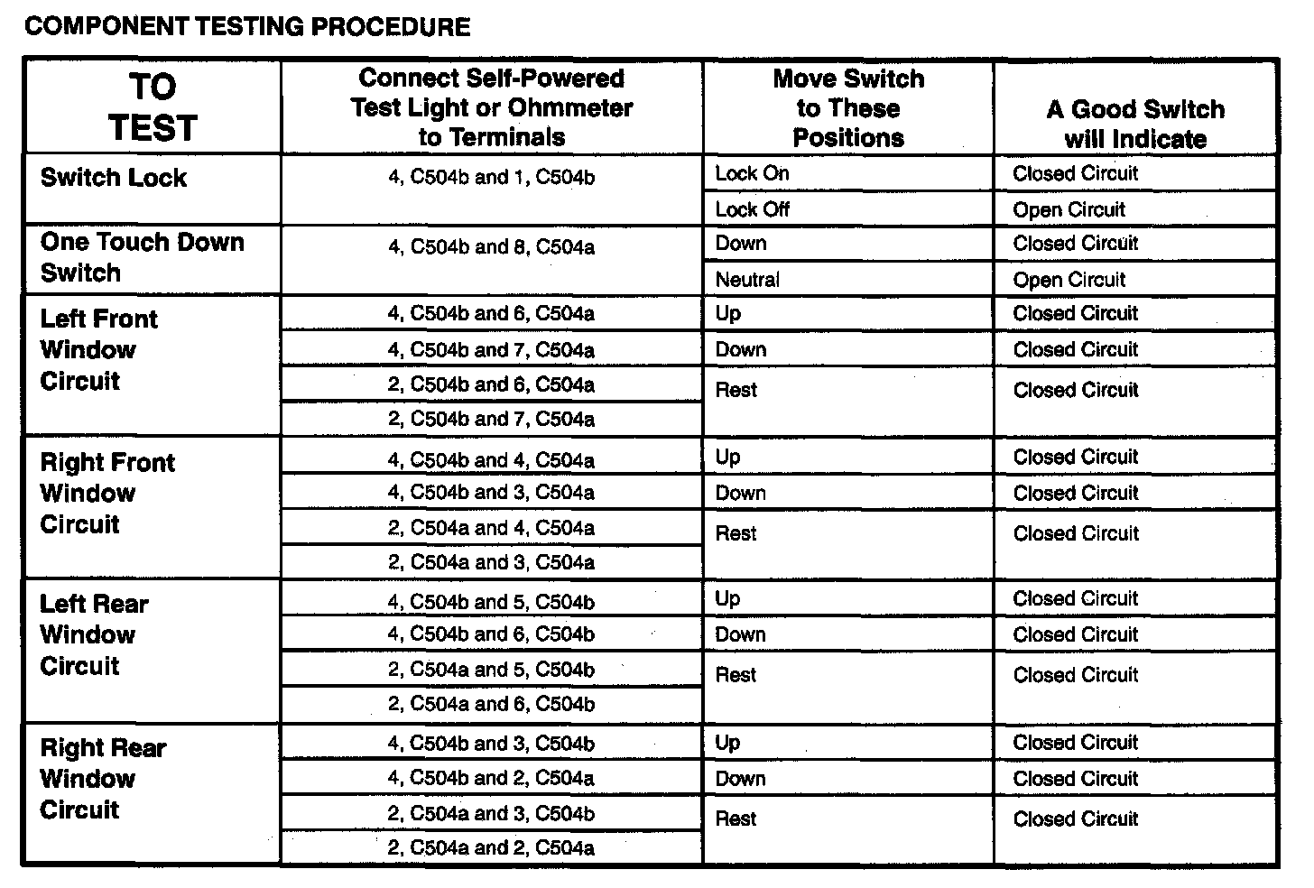 The component connector MUST BE REMOVED before testing. To test a single circuit within the component, select that circuit under the column TO TEST. If you wish to test the complete component, perform all tests.