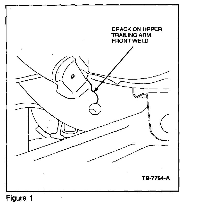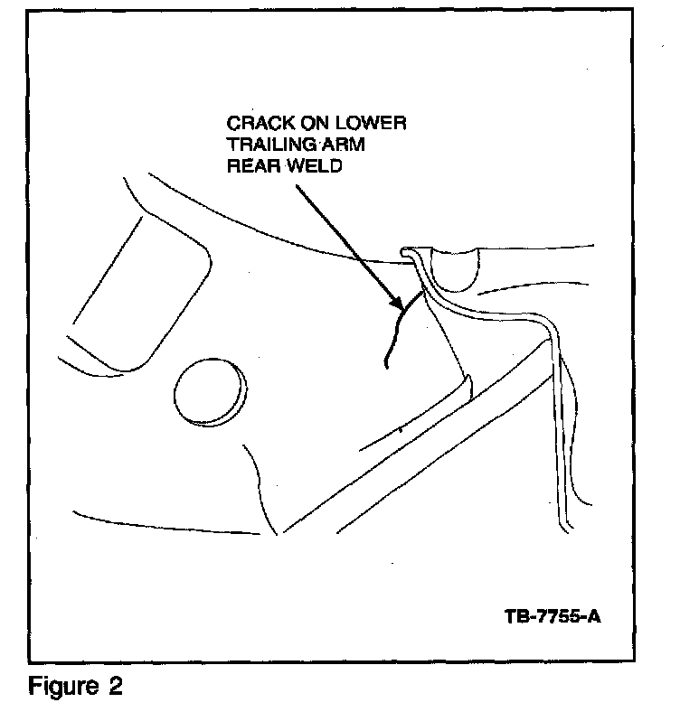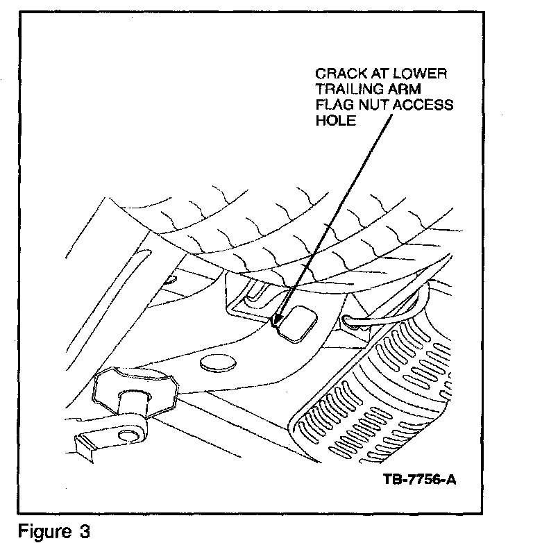 Some 1998-2002 Crown Victoria vehicles used for heavy-duty type service (Police/Taxi/Limo) may exhibit cracks in the rear of the frame side member between the upper and lower trailing arm brackets, or around the opening to the lower trailing arm bracket access hole for the flag nut in the bottom of the frame. These cracks may result from driving events that place extreme stress on the frame (i.e. rear vehicle impact, driving over curbs, high speed through driveway transitions, becoming airborne etc...). Refer to Figures 1, 2 and 3 for examples of cracks.