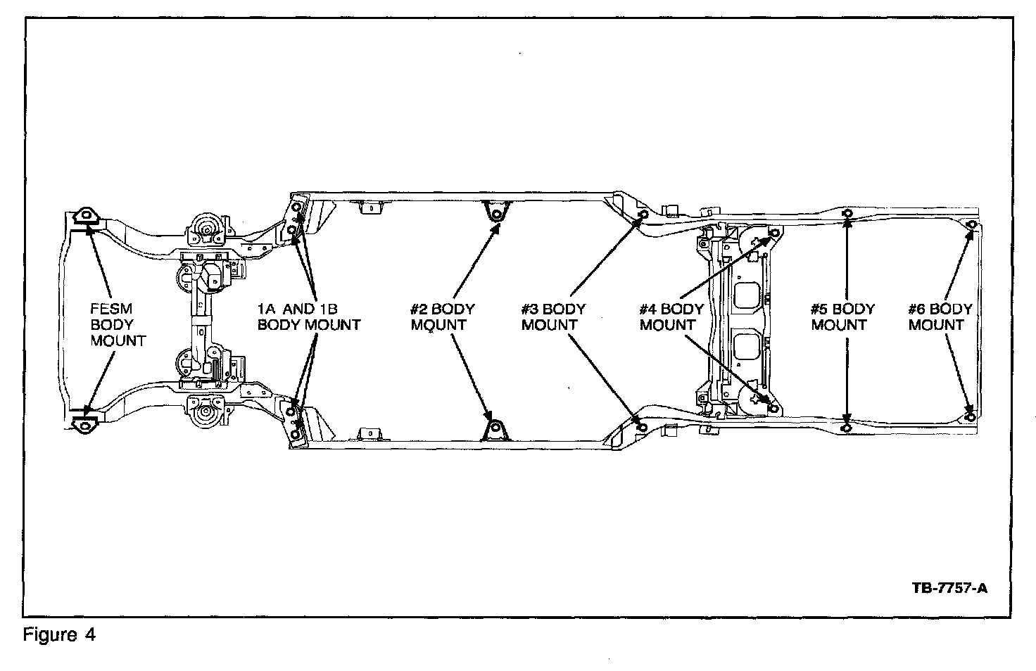 8. Remove the # 2, 3, 4, 5, and 6 body mount bolts on both sides. Refer to (Figure 4) for locations of body mount bolts.